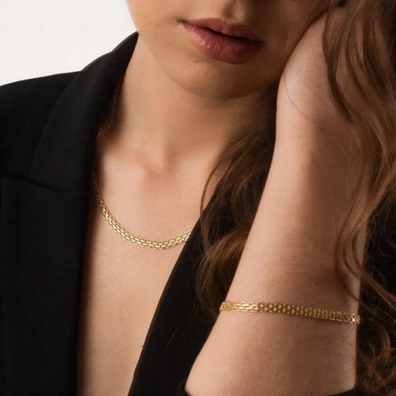 Przedstawiamy państwu wyjątkowy złoty zestaw o splocie Bismarck. Produkt został wykonany z najwyższej jakości srebra próby 925. Ten model bransoletki i łańcuszka jest solidny i wytrzymały, więc spokojnie posłuży na długie lata. Bransoletka została pokryta grubą warstwą 14 karatowego złota próby 585.
